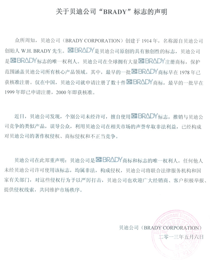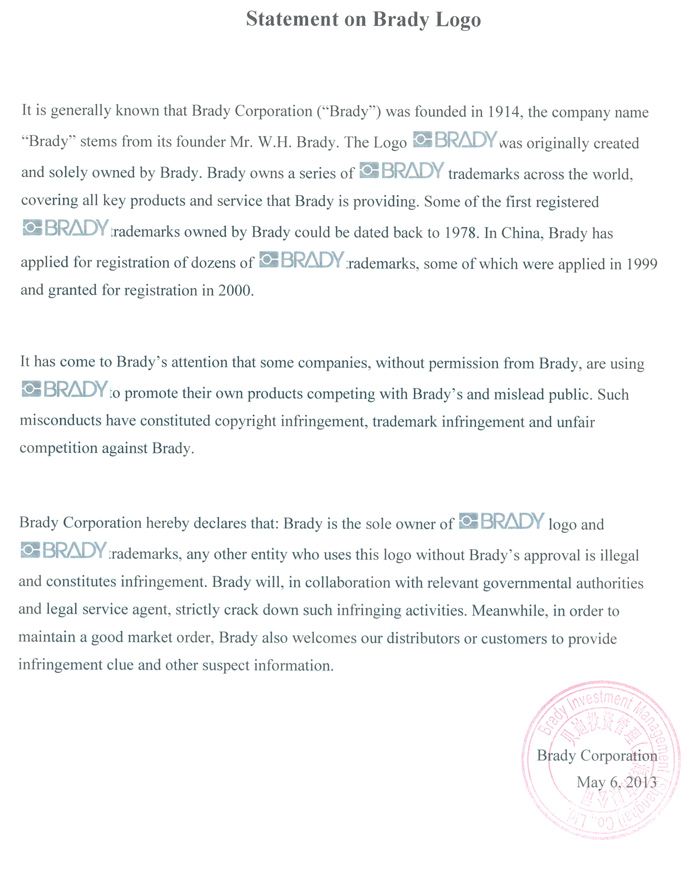 關(guān)于貝迪公司“BRADY”標(biāo)志的聲明